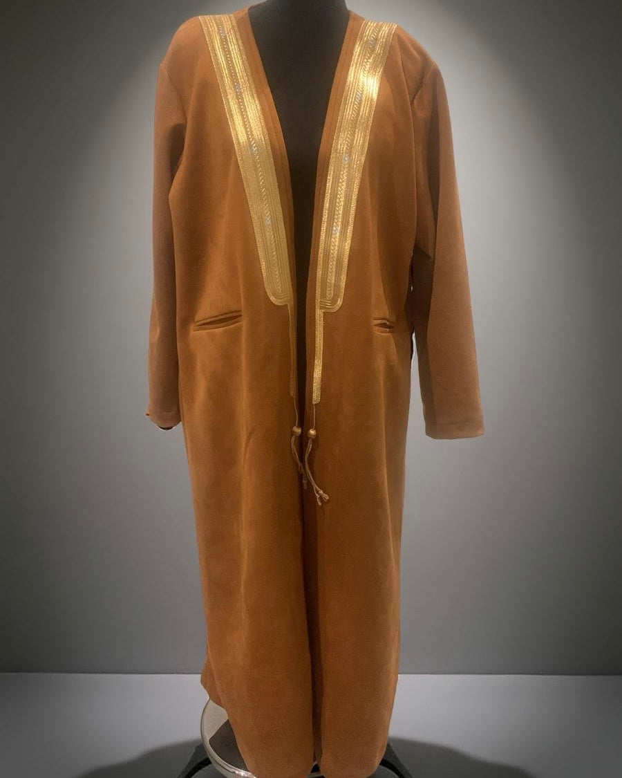 High end suede fabric in Kuwaiti authentic inspired design in Camel , comes with an optional brooch .