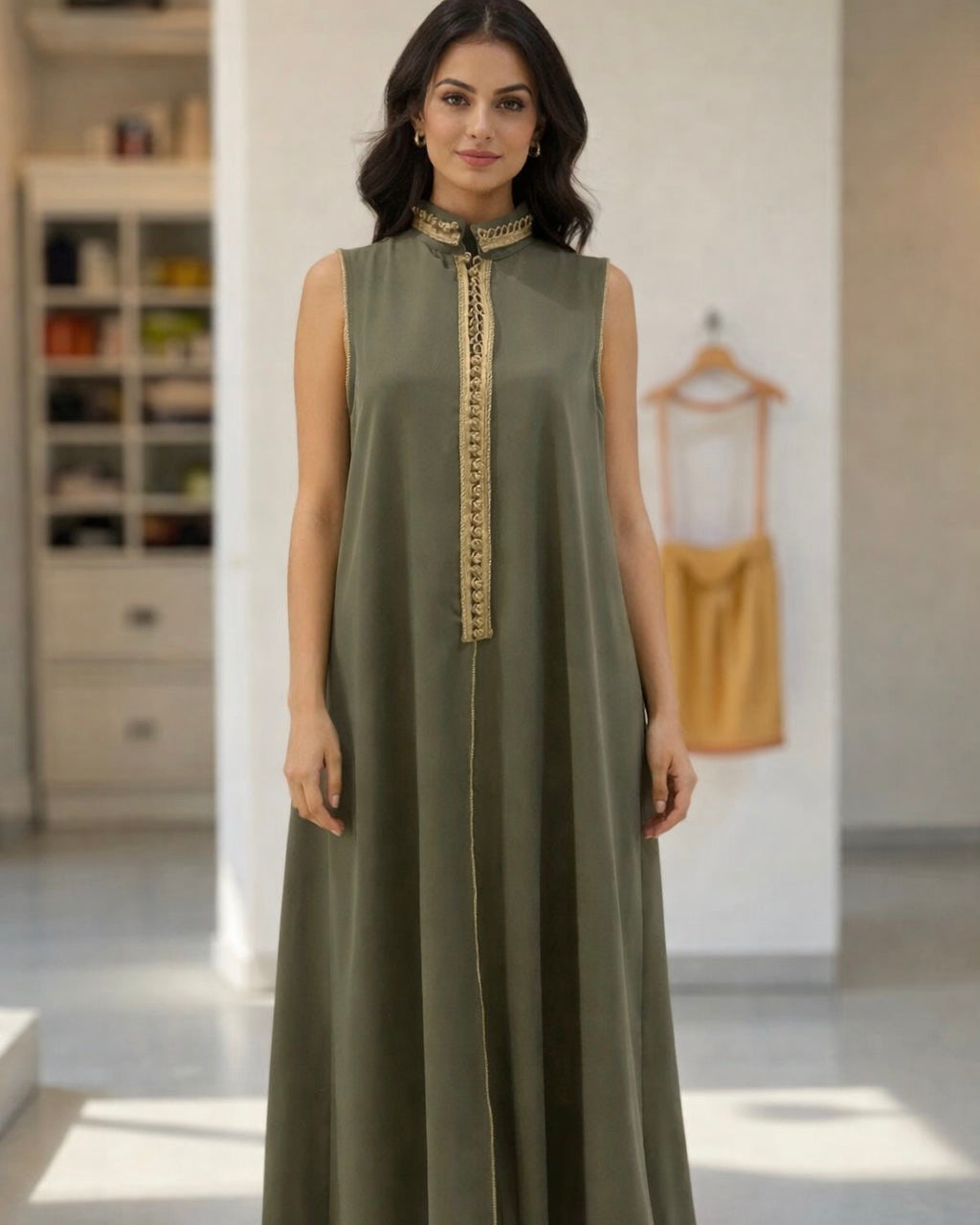 Sleeveless olive Crepe Kaftan .